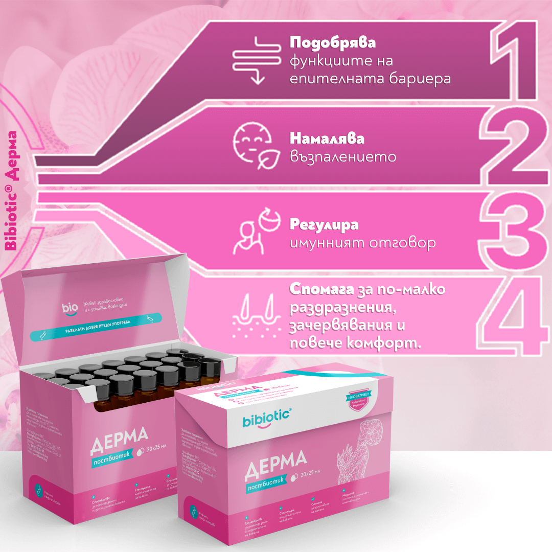 Bibiotic® Дерма е постбиотична хранителна добавка, предназначена за хора с кожа, склонна към акне, дерматити, сухота и прочие.