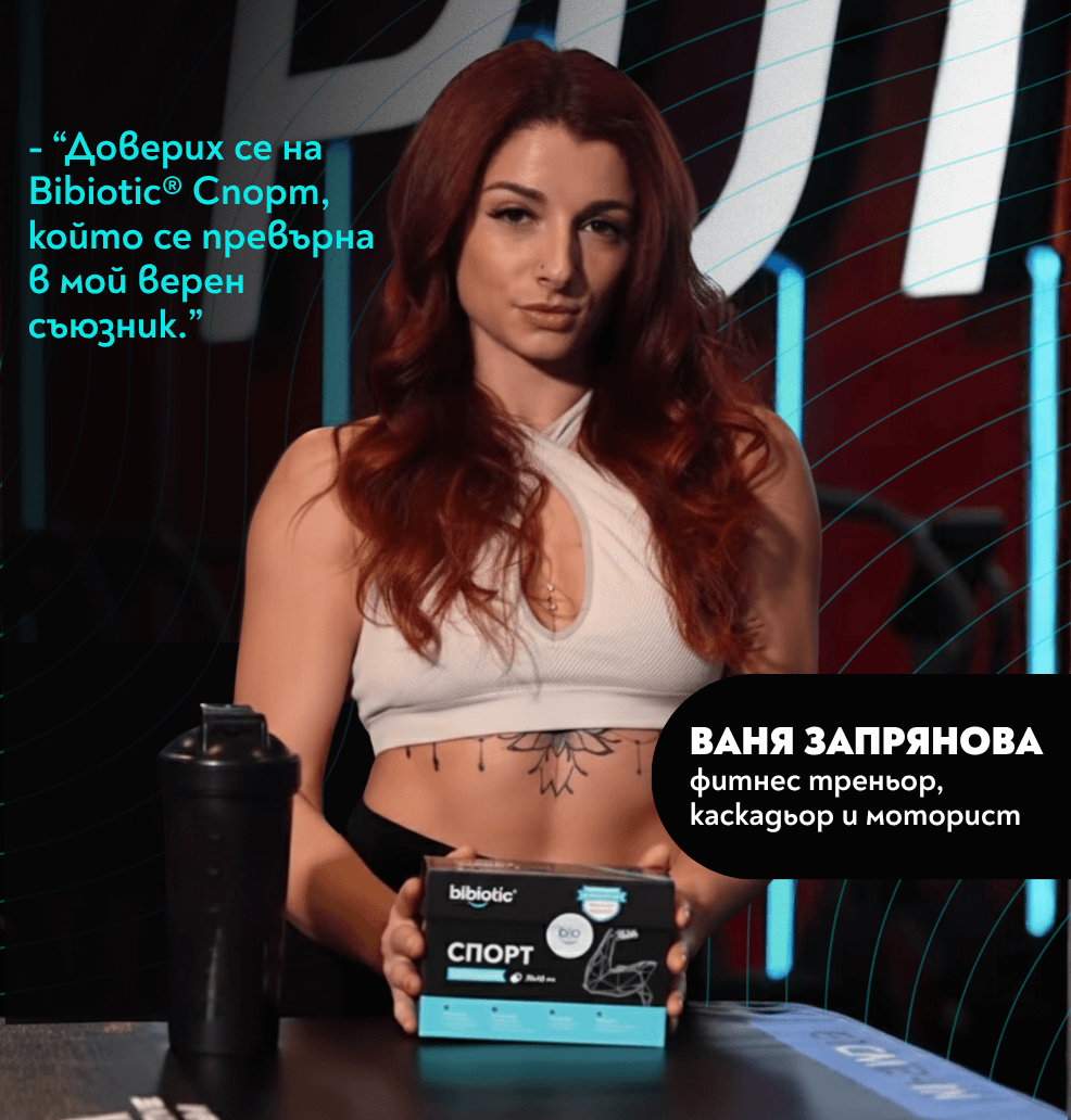 - Доверих се на Bibiotic®Спорт, който се превърна в мой верен съюзник. Откакто го приемам се чувствам значително по-активна и забелязвам по-бързо възстановяване след тренировка...