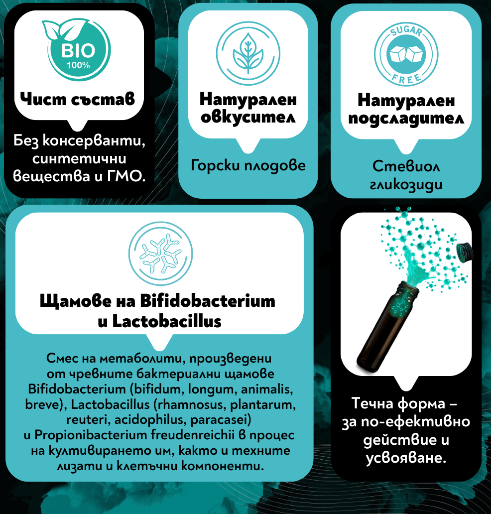 Състав: Смес на метаболити, произведени от чревните бактериални щамове B. bifidum, B. longum, B. animalis, B. breve, L. rhamnosus, L. plantarum, L.rеuteri, L. acidophilus, L. paracasei и P. freudenreichii в процес на култивирането им, както и техните лизати и клетъчни компоненти.