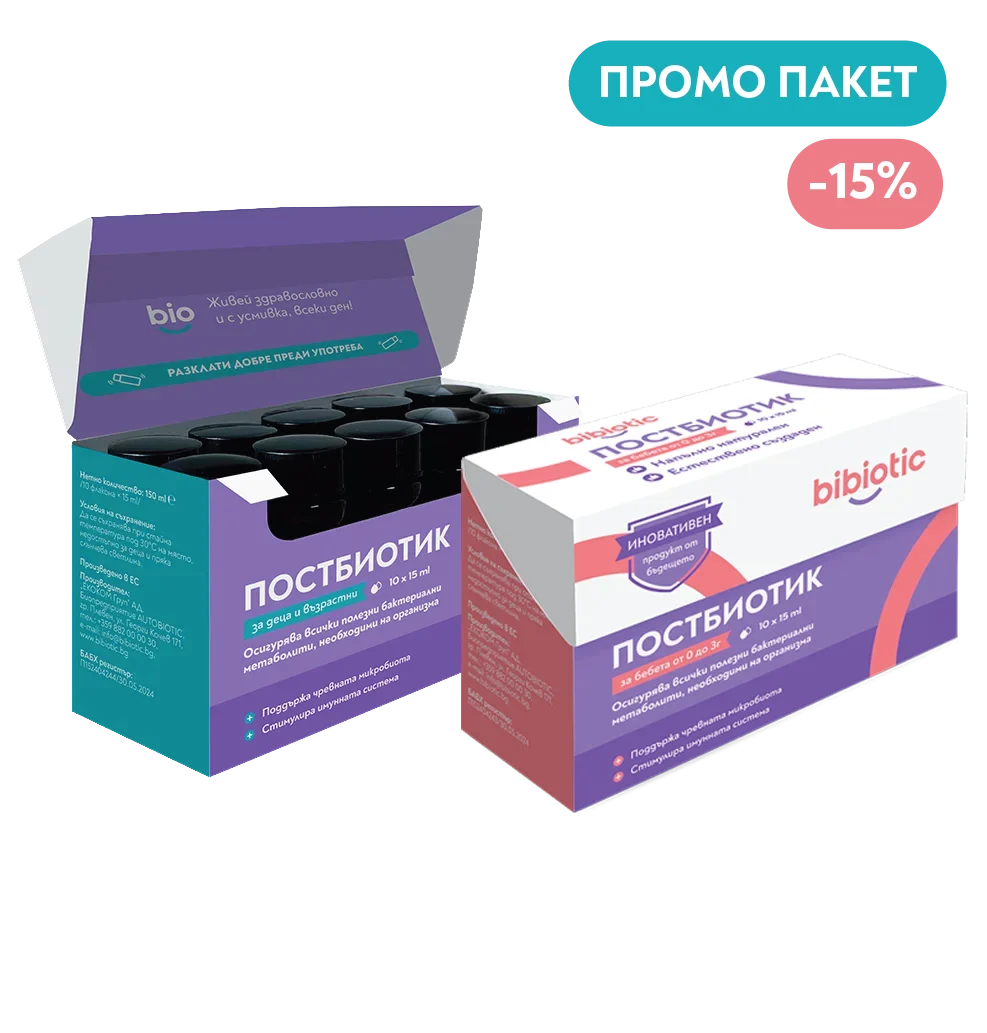 Bibiotic® за деца и възрастни е универсална постбиотична формула, създадена да поддържа чревното здраве и имунитета на деца над 3 години и възрастни. Подходящ е при натоварено ежедневие, пътувания, стрес или промени в хранителния режим – фактори, които често водят до дискомфорт, подуване и нарушен баланс на микробиома. Продуктът спомага за по-добро храносмилане, редуцира усещането за тежест и съдейства за по-силен и устойчив организъм през цялата година.